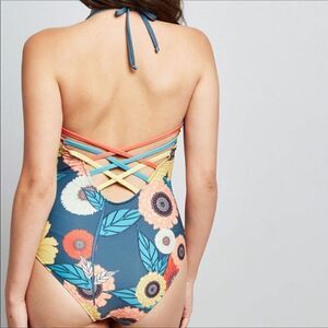 New no tag, Very cute dark teal retro floral print halter straps full bottom coverage