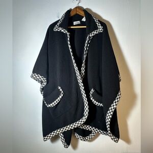 Chic black poncho with stylish white houndstooth trim. Perfect for layering and adding elegance to any outfit.