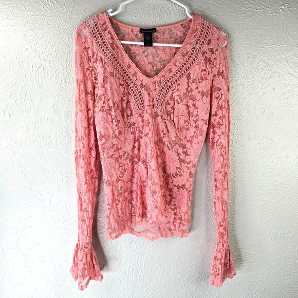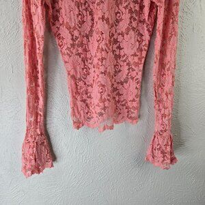 Moda Floral Lace Blouse Medium Pink Sheer Bell Sleeve Dressy Fairy Coquette Top