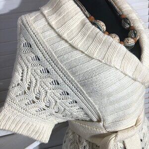 This vintage Y2K sweater dress by Moda Internacional (Victoria's Secret) offers a cozy and stylish look in a soft cream color. It features an intricate cable knit design and includes a belt. Perfect for layering, this piece has a flattering fit and timeless design.