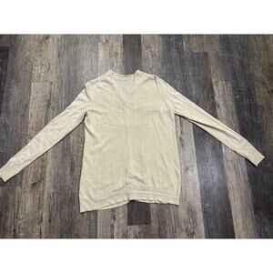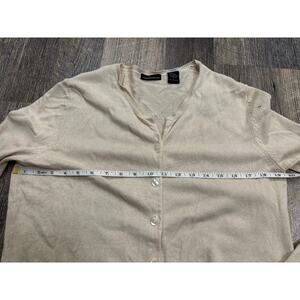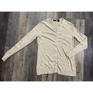 A classic beige cardigan from Moda International featuring a button-up and long sleeves. Made from a soft fabric blend, this piece is perfect for layering in cooler weather. It is a size large and is in excellent used condition.