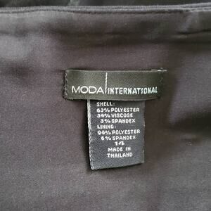 Moda International strapless dress with ribbon around the bust line and down the dress, padding in the chest, and a side zipper closure. This dress is pre-loved and in great condition (no stains, no rips, or damage and comes from a smoke and pet-free environment).