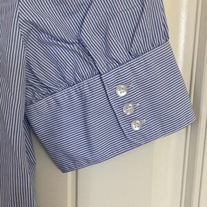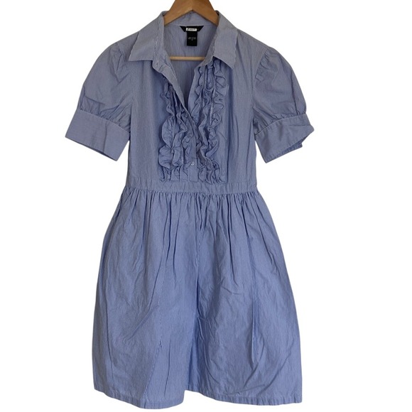 Chic blue dress with elegant ruffle details. Short sleeves and collared neckline. Perfect for any occasion.