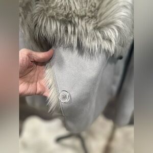 This is a vintage Moda International coat for women in size L. It is a short gray suede coat with faux fur lining and fur trim accents. The jacket has a button closure, a collared style, and is suitable for casual occasions during fall and winter. The outer shell material is suede, and the lining material is faux fur, making it a cozy and stylish choice for the colder seasons.
