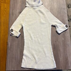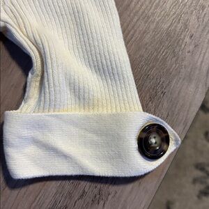 Stylish ribbed turtleneck top. Features buttoned sleeves. Perfect for layering.
