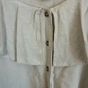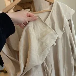 Lightweight cream blouse with ruffle neckline. Button-front closure and long sleeves. Soft drape for easy layering. 100% raw silk. in excellent condition.