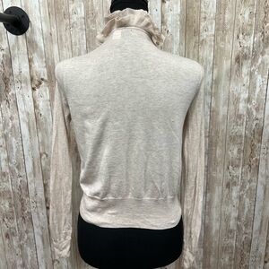 This elegant cream cardigan from Moda International features a dramatic ruffled trim along the neckline and front, adding a touch of sophistication to its cropped design. The long, fitted sleeves and open front make it perfect for layering over your favorite outfits.
