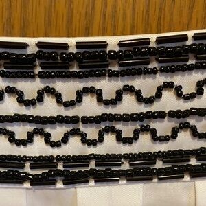 Chic white blouse with black decorative accents. Sleeveless design. Perfect for versatile styling.