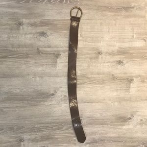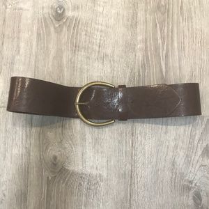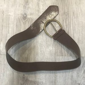 Moda International wide leather belt in brown with a golden buckle. The entire belt measures about 42 inches long and is a size Medium. The buckle is about 3 inches long and the leather brown strap measures about 39.25 inches long and 3 inches wide. Has 5 belt holes for getting the perfect fit. It's a great statement piece! Has some minor wear from use, but still in great condition. Leather.