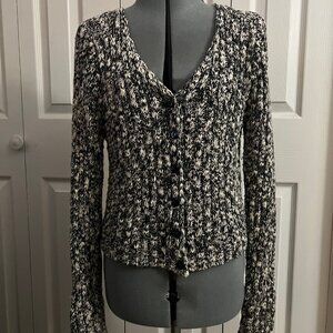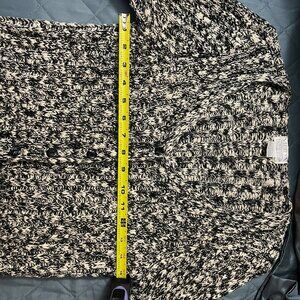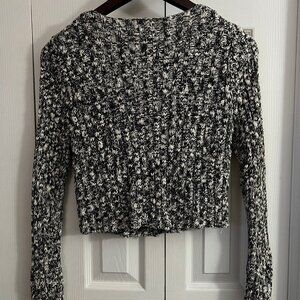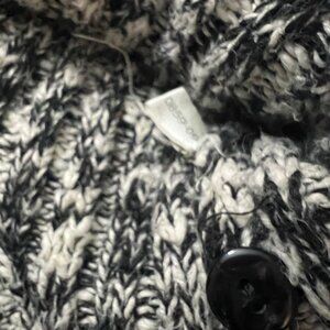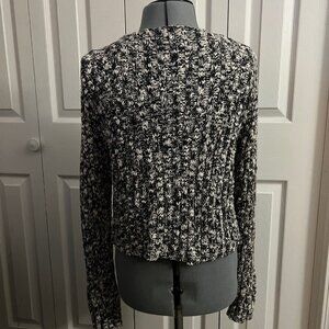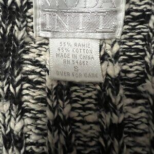 Chunky marled knit cardigan by Moda International in black and white. Super soft texture with a 3-button front, slightly cropped fit, and cozy ramie/cotton blend. Great for layering, Y2K looks, or a comfy fall/winter outfit. In excellent condition.