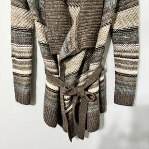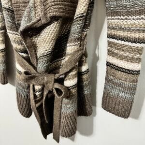 Wrap yourself in the ultimate comfort with this open cardigan! Featuring a stylish striped pattern and a soft mohair wool blend, this cardigan is perfect for adding a touch of boho chic to your fall wardrobe. The tie around the waist allows you to customize the fit and create a flattering silhouette.