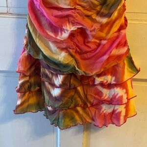 Vibrant mini dress with multicolor design. Features playful ruffles and sleeveless style with liner.