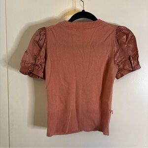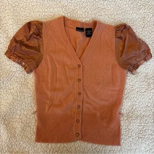 Pink v neck cardigan with puff satin sleeves. Small string belt loops intact and attached, belt not included.