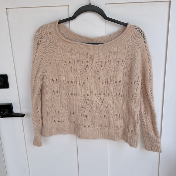 A beigey-pink-dusty rose colored sweater made of soft rabbit hair/nylon/wool blend. Cute layered over a ruffle tank or a button up shirt with a collar. Wear plain as well, just remember it has holes knitted in.