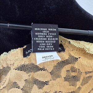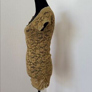 Moda International see-through shimmery sheer soft stretch lace top with scallop neckline, cap sleeves and ruched sides. Form fitting. Color is a dark gold, almost like dull brass.
