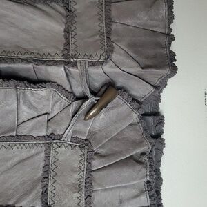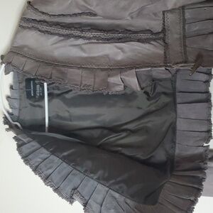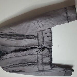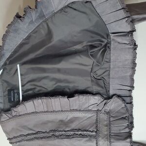 Slightly cropped pleated ruffles with 1 button closure. Good pre-owned condition. Approximate measurements provided. Victorian. Renaissance. Rockabilly. BoHo. Concert. Festival. Feminine. Whimsigoth. Fairy. Edgy. Grunge. Streetwear.