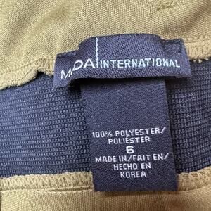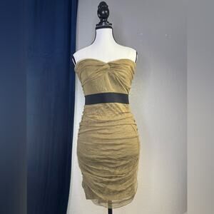 Rare vintage Moda International strapless dress from Victoria’s Secret’s Fall 2007 collection. Olive green stretch fabric with a built-in black belt detail (not removable). Fully lined in ultra-soft material for comfort — no shelf bra, but features hidden stay-up grip strip inside upper bustline.