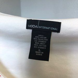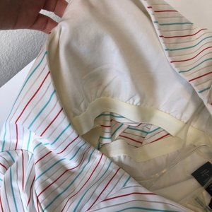 Aqua blue, red, and sheer thin stripes on a white top. Nylon/poly/spandex blend with a built in cotton/spandex shelf bra. Size large is 18” pit-to-pit and 22” long. Top has never been worn. There is a very small snag 4” from bottom on back left side (see last pic).