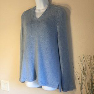 Moda International baby blue ramie cotton blend pullover sweater with hood. Features a relaxed v-neckline, long sleeves, and lightweight knit construction. Excellent pre-owned condition with minimal signs of wear. Size Small. See photos for exact measurements.