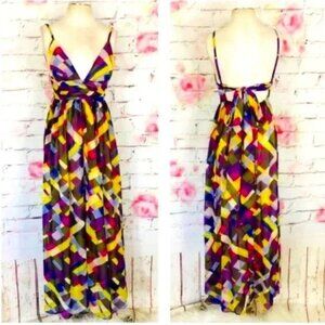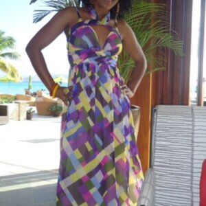 Moda International Women's Multi Color Halter Deep V-Neck Maxi Dress SZ S/P
