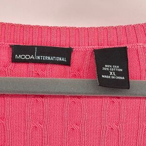Moda International, silk cotton sweater, pink pullover, cable knit, soft knit top, classic style, cozy chic, workwear, everyday sweater, women’s XL, moda international sweater, moda international pullover, silk cotton sweater, pink cable knit sweater, women’s pink sweater, scoopneck sweater, soft knit pullover, classic knitwear, cozy pink sweater, office casual outfit, weekend style sweater, comfy chic knit, preloved silk sweater, timeless wardrobe staple, everyday cable knit, Moda International women’s sweater XL, pink silk cotton cable knit pullover, silk blend crewneck sweater, scoop neck long sleeve sweater, casual soft knitwear, textured pink pullover top, business casual sweater, classic knit jumper, women’s pink silk blend sweater, comfy pullover for work or weekend
