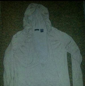 @umonkey it has a wide deep vneck- and a hood---hood is attached so its all one peice- not a multi wear sweater- its so soft just very different- you would need a cami underneat bc the v is so deep