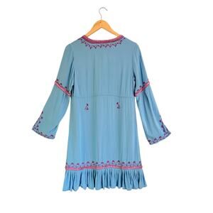 Moda Int’l Embroidered Tibbon Bohemian Dress Sz M Blue Pink Festival