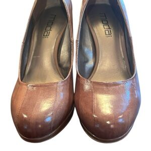 Moda Spana Kimberly Latte Taupe Brown Patent Leather Heels. Comfy Round Toe with textured eel-look design.