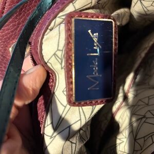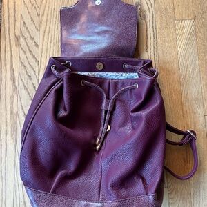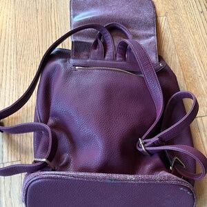 Gorgeous burgundy\mauve backpack that I think is faux leather because there's no tag saying it's leather. But it's hard to tell because it's so nice! Measures 13"x16.5". The hardware accents are rose gold, and the white lining make it MUCH easier to find things inside than when lining is black!