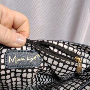 A beautiful navy crossbody by Moda Luxe. The bag has an adjustable and removable crossboy strap and is made of faux leather and offers a contemporary way to carry the essentials. The bag has a foldover magnetic closure and external slip pocket and internal slip and zippered pockets. All of this provides you a way to keep your daily must haves secure while you are on the go. The bag is in very good condition with a few minor callouts that are noted in the last 3 pictures.