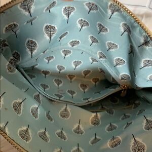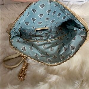 This is a pretty bag that can be folded into a half size, or can be used as a clutch, with detatchable chain strap. Mesaures 11" X 11" unfolded and lying flat. In very good pre-owned condition. Normal wear and tear noted, but no flaws or damage. Please review pictures and feel free to ask any questions or for more pictures prior to purchasing.