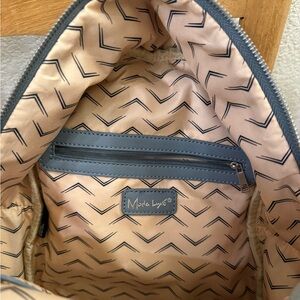 Chevron pattern interior with zip pocket, blue stripes exterior. Moda Luxe brand. New with tags