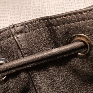 The bag features a slouchy hobo silhouette with a cinched top & a long strap, which is consistent with the style of a sling bag. The exterior is adorned with stud embellishments. The material is faux leather / vegan leather.