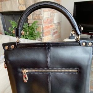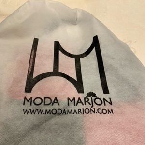 Beautiful and classic Black and Red Moda Marjon leather bag. Used once - looks like it just came from the store. Leather shoulder strap is still wrapped from original purchase. Includes dust/storage bag. Purse is 11" H x 10" W x 3" Depth. Leather handle is an additional 4" tall. Two Zip pockets inside as well as two pockets for cell phone, etc. Zipper across interior keeps all your valuables safe, in addition to two snaps on the front flap of bag.
