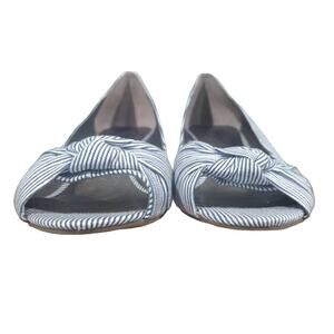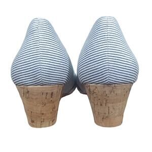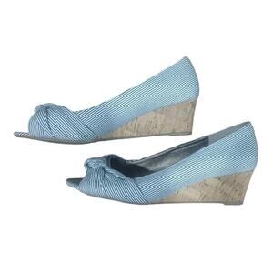 This is a really cute size 8.5 pair of cork wedge heel peep toe shoes. They are made of a navy and white striped fabric with some tiny sparkles and knots on the top. This pair of shoes is new without box.