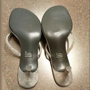These have bling across the top of the foot are silver and have the half inch kitten heel. From a smoke free home if you have more questions just ask.