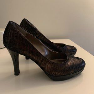 Dress up your look with this pair of black/gold pumps! About a 3 inch heel - very comfortable and padded so it feels like you're walking on foam. They are slightly used but still look new, as they've only been worn indoors. The black shmutz on the inside of the right shoe is from the tag.