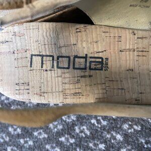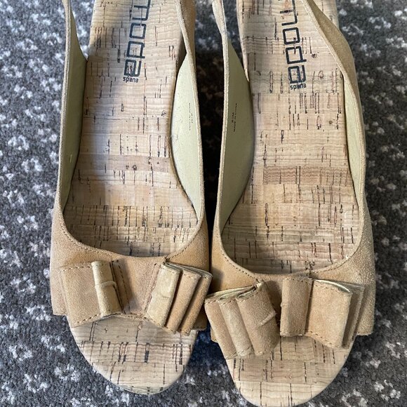 Taupe suede leather uppers with stylized bows on toe. Platforms 1 1/2” front. Heels 3 1/4”.