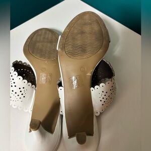 Chic white sandals with perforated design. Ideal for casual outings. Comfortable and stylish. See pics for heel measurement. These are in great condition. Perfect addition to your outfit.