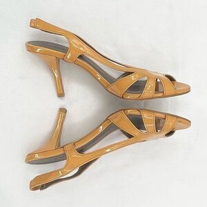Moda Spana Golden Tan Strappy Patent Slingback Open Toe Heeled Sandals Size 7