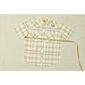 Bring vibrant Western flair to your wardrobe with this new-with-tags Moda Tech Men's Yellow and Blue Plaid Western Snap Shirt. This classic short-sleeve shirt features a lively plaid pattern in shades of yellow, blue, red, and white, making it a standout piece for casual wear. Crafted from 100% cotton, it offers exceptional comfort and breathability, perfect for warmer days. The shirt is designed with traditional Western yoke detailing on the front and back, along with full snap closures down the front and on the two chest pockets, enhancing its authentic Western appeal. The