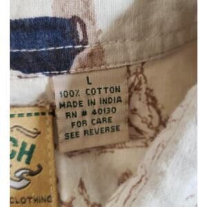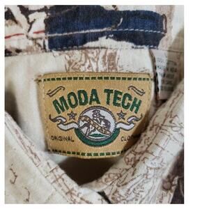 Moda Tech long sleeve western-style shirt featuring an allover sepia-toned cowgirl print with desert and horseback scenes. Tagged a size L but measures closer to a modern small/medium (19" pit to pit). Great for rodeo season, country concerts, state fairs, or styling with cowboy boots, cutoffs, or a suede vest. Works year-round and especially well for fall events, Labor Day weekend, or cherry-coded cottagecore wardrobes. Rare western graphic print.
