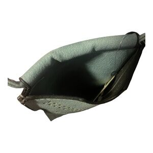 The Moda West Crossbody Purse is a small bag made of blue-gray vegan leather with perforation embellishments. It features a crossbody strap with a 23-inch drop, making it ideal for travel or casual occasions. The bag has a geometric pattern and a matte finish, adding a boho touch to its design. The interior is lined with faux leather and linen in a matching color, providing a stylish and functional accessory for women on the go.