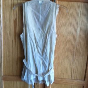 Beautiful shear beige sleeveles shirt with rhinestones and silk beads .It has a sash that ties at the waist and is pleated on the back. Is made of cotton and silk