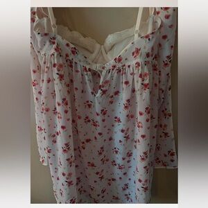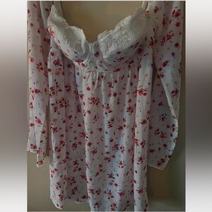 Moda International long-sleeved top with a white base and a multicolor floral pattern. It has a sweetheart babydoll style with a lace trim and a gathered corset bust. Clip bra back