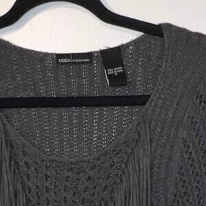 Moda International women’s size small fringe open knit scoop neckline, open knit sleeve ribbed body-con sweater mini dress