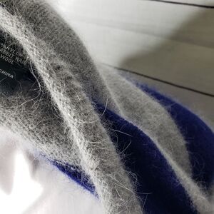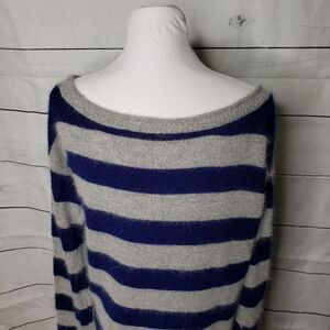 Moda International grey and blue striped low cut sweater. rolled collar.