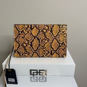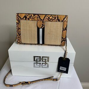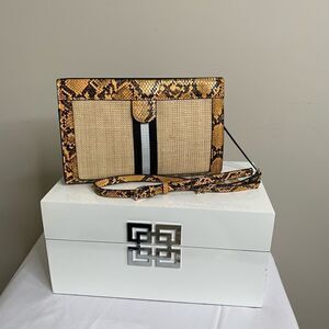 Clutch made of Faux Leather with a faux straw panel. Magnetic Snap closure