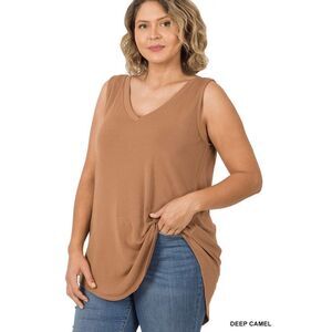 Modal Sleeveless V-Neck - Hi-Low Hem Top - Deep Camel