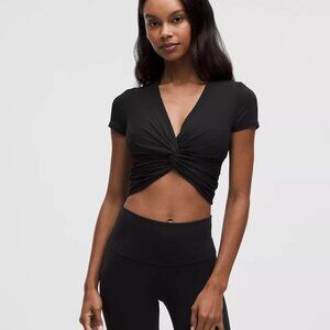 Bliss with a twist. Made from a luxurious blend of silk, this cropped short sleeve features a twist-front detail to give your look a little something extra.